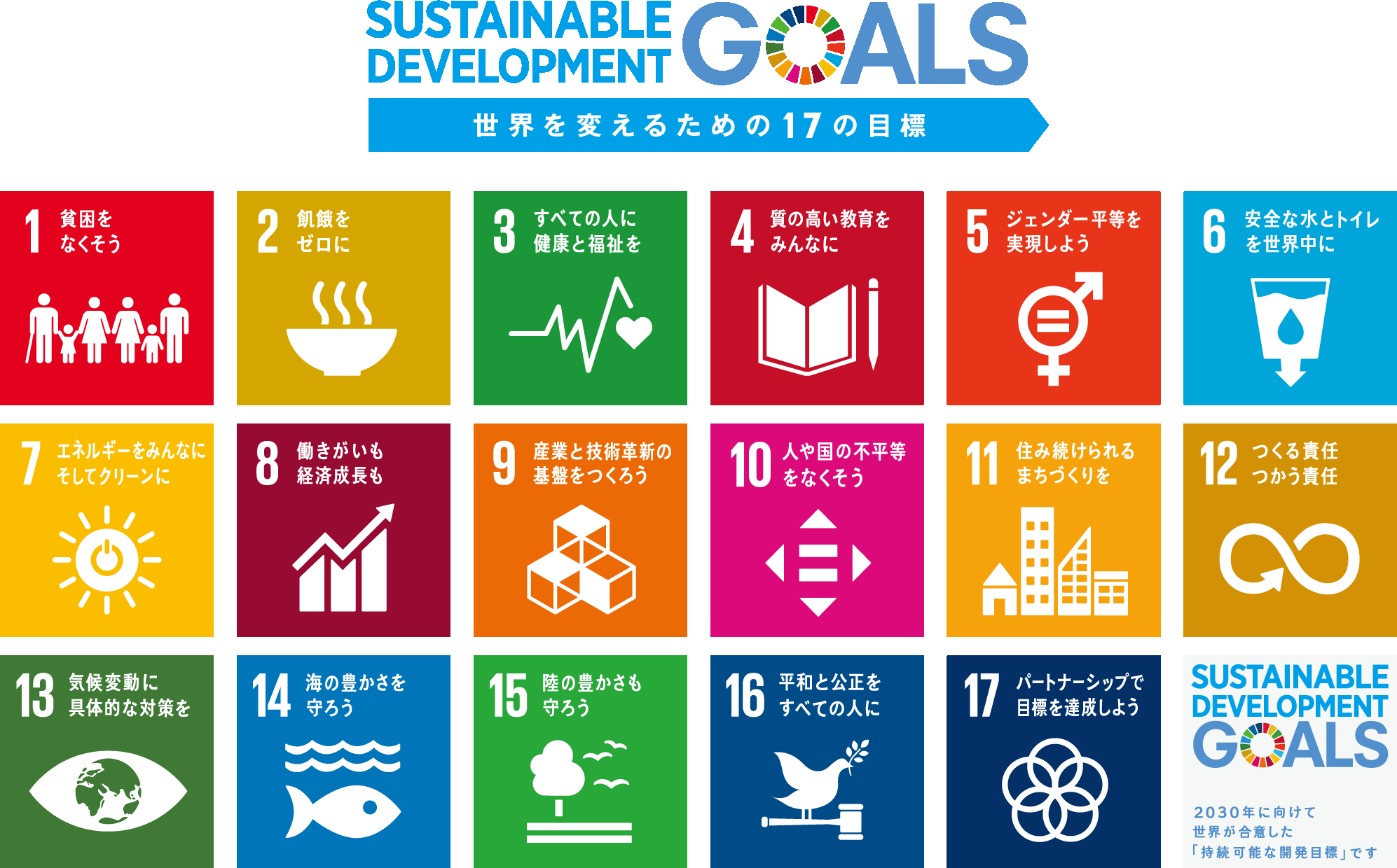 持続可能な開発目標(SDGs)とは、2001年に策定されたミレニアム開発目標(MDGs)の後継として、2015年9月の国連サミットで採択された「持続可能な開発のための2030アジェンダ」にて記載された2016年から2030年までの国際目標です。